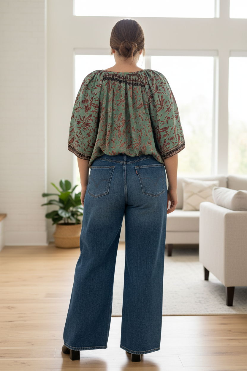 A stunning round neck top/tunic handmade with care from a beautiful vintage silk sari. This pretty top features wide 3/4 sleeves, a gathered neckline which can be adjusted around with string. It give a flowing look and fits from small to large size. You can wear with jeans or skirt or just style with a belt.