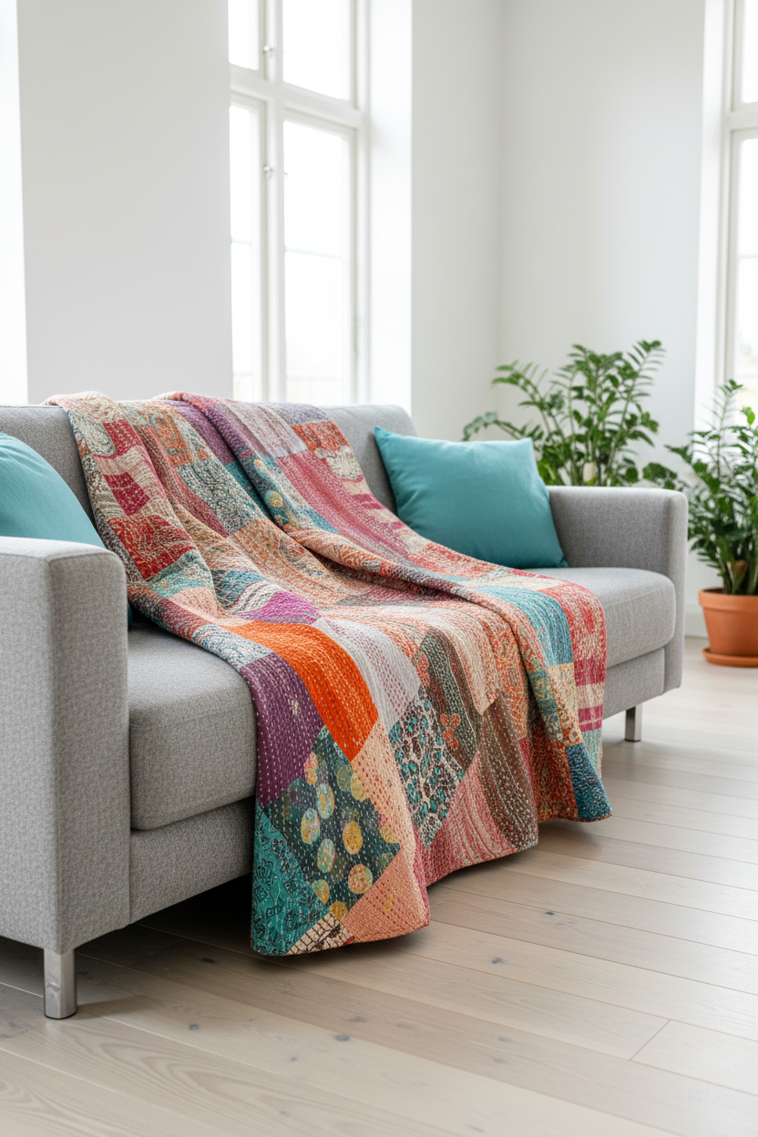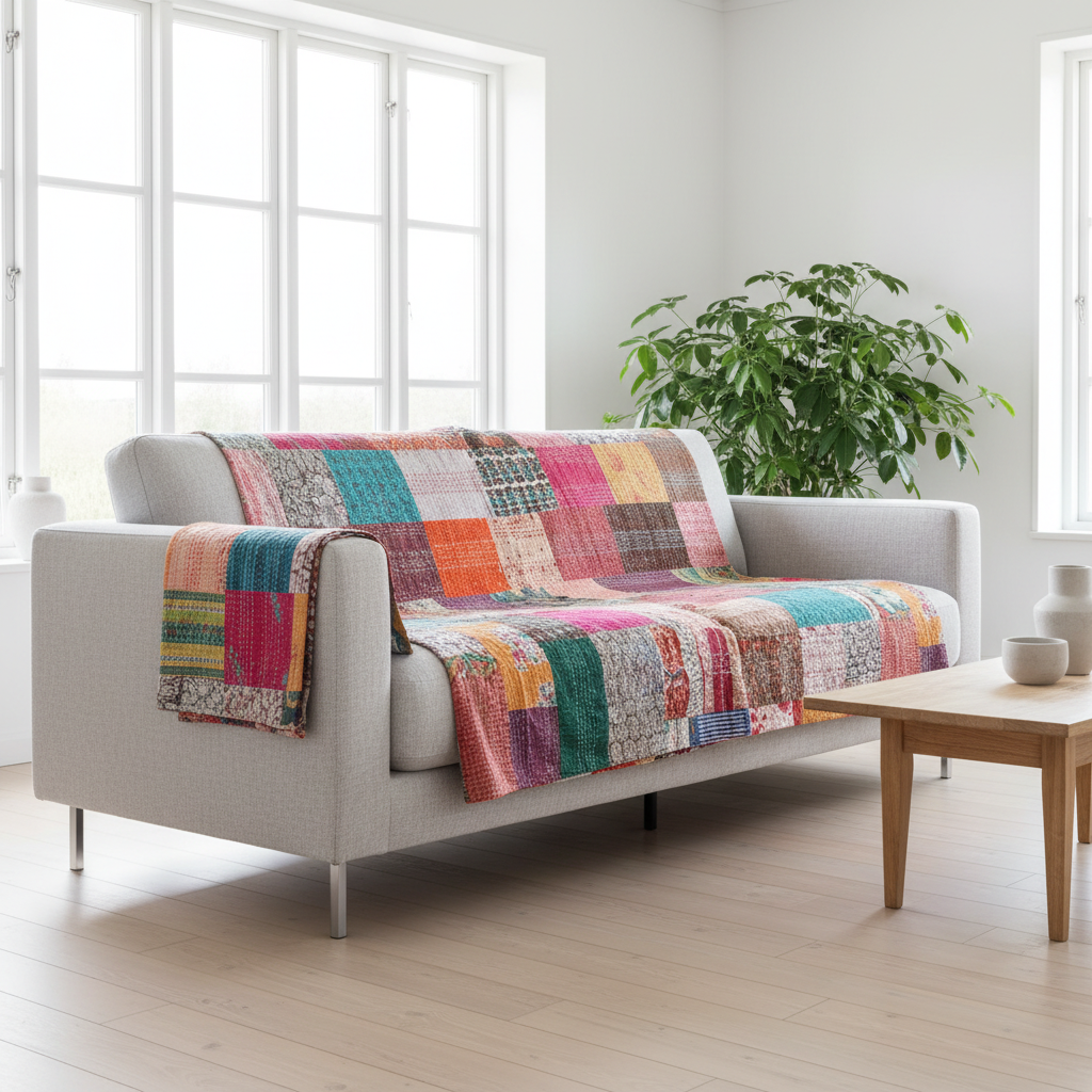 Add that touch of color to your lounge/bedroom with this Handcrafted patchwork stonewashed Kantha Bed Spread/ Throw/ Quilt.