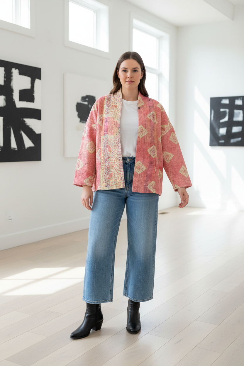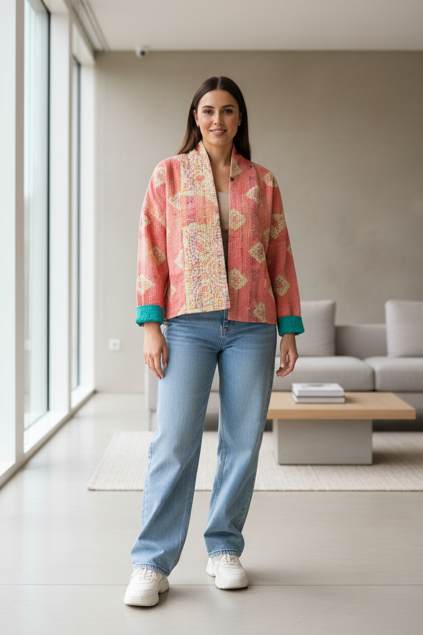 Beautiful handcrafted reversible kantha cotton jacket is made with layers of recycled sari cloth. It has easy fitting with two big patch pockets on front sides of the jacket. Vintage Sari piping detail all over to add definition on the reverse side of the jacket. Each jacket is unique, reversible, varying in pattern and color. One in two jacket. Wear it as you like. You can wear it with long/short skirt, long/short dress, jeans, formal pants. Being handmade, no two are the same. Each Piece is handcrafted with utmost attention to detail.