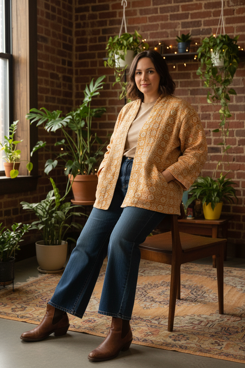 Beautiful handcrafted reversible kantha cotton jacket is made with layers of recycled sari cloth. It has easy fitting with two big patch pockets on front sides of the jacket. Vintage Sari piping detail all over to add definition on the reverse side of the jacket. Each jacket is unique, reversible, varying in pattern and color. One in two jacket. Wear it as you like. You can wear it with long/short skirt, long/short dress, jeans, formal pants. Being handmade, no two are the same. Each Piece is handcrafted with utmost attention to detail.