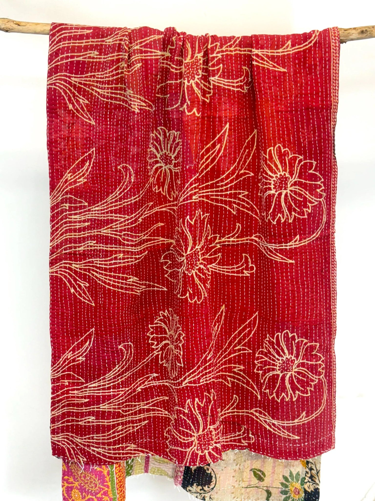 The entire quilt is painstakingly embroidered with thousands of small and delicate kantha stitches to create a one of a kind masterpiece! Both sides have different patterns. Kantha quilts consist of several layers of recycled cotton or saris, They are held together by a simple, running, “Kantha” stitch that is applied row after row and gives the fabric its unique, slightly old, wrinkled effect. This kind of embroidery is most popular with the rural women of India, who spends hour upon hour creating these wonderful, one-of-a-kind pieces. The top layer of the quilt may start peeling off (due to wear), letting the layer below shine through.