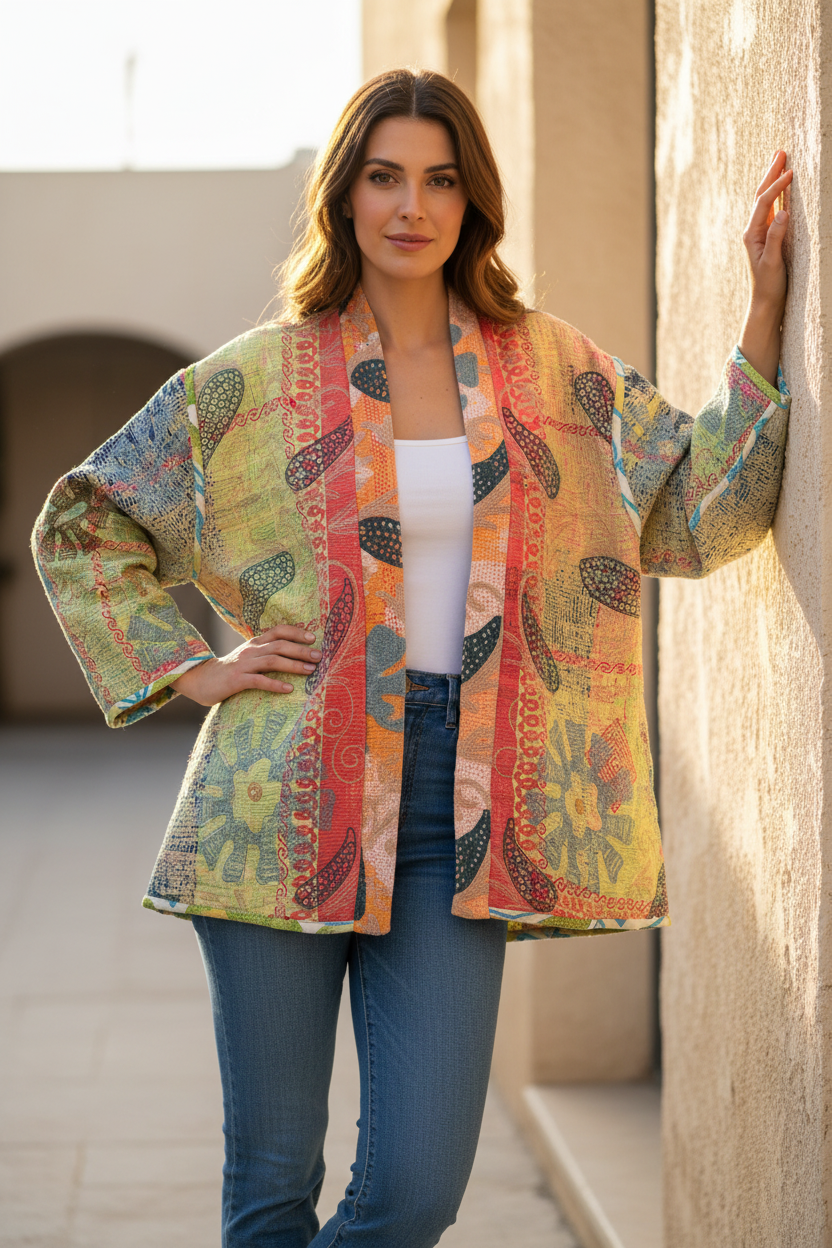 Both sides are adorned with detailed Suzani-style embroidery and traditional kantha stitching, offering unique, eye-catching patterns. The reversible design gives you two distinct looks in one jacket—perfect for boho-chic styling, artisanal fashion, and eco-conscious wardrobes.