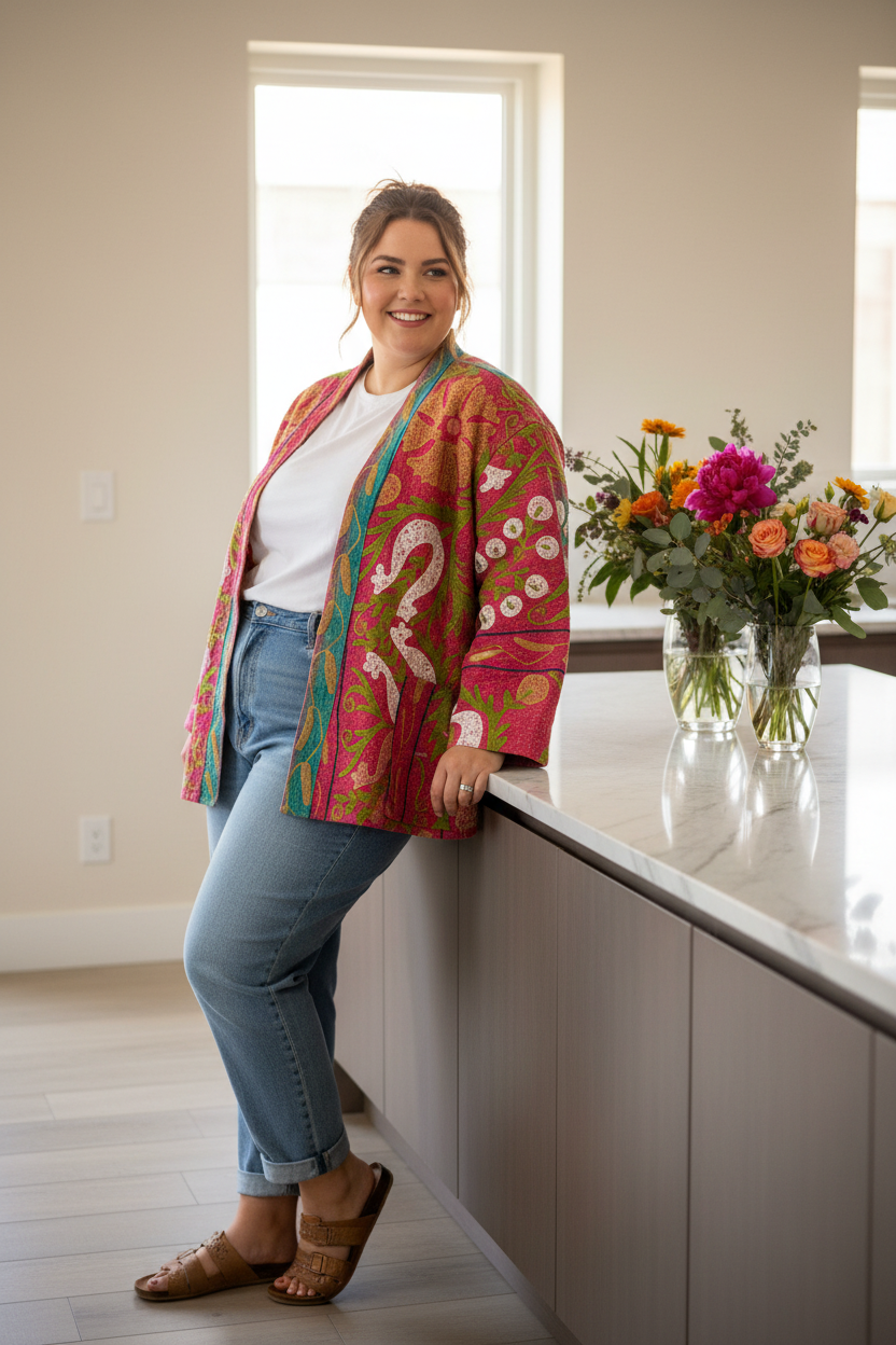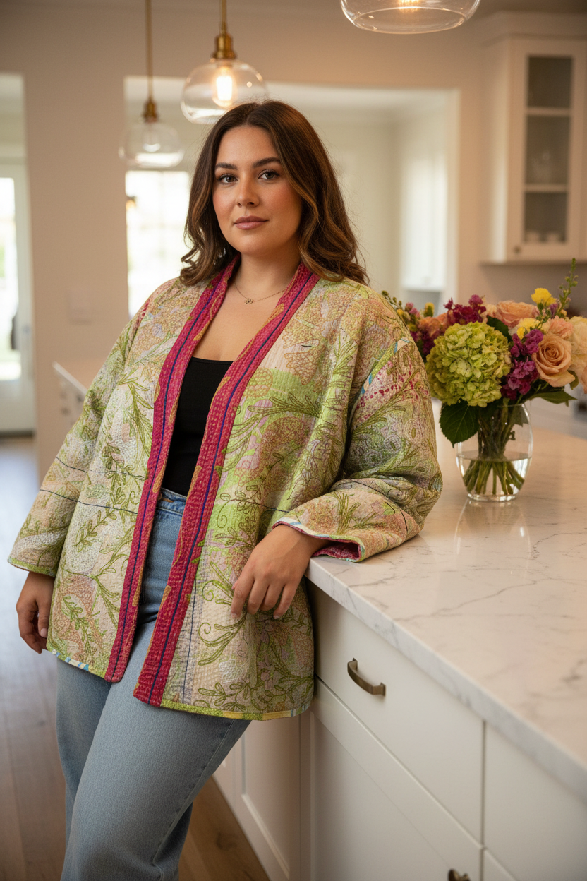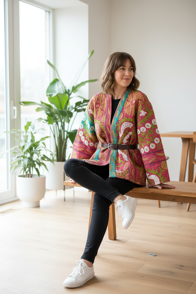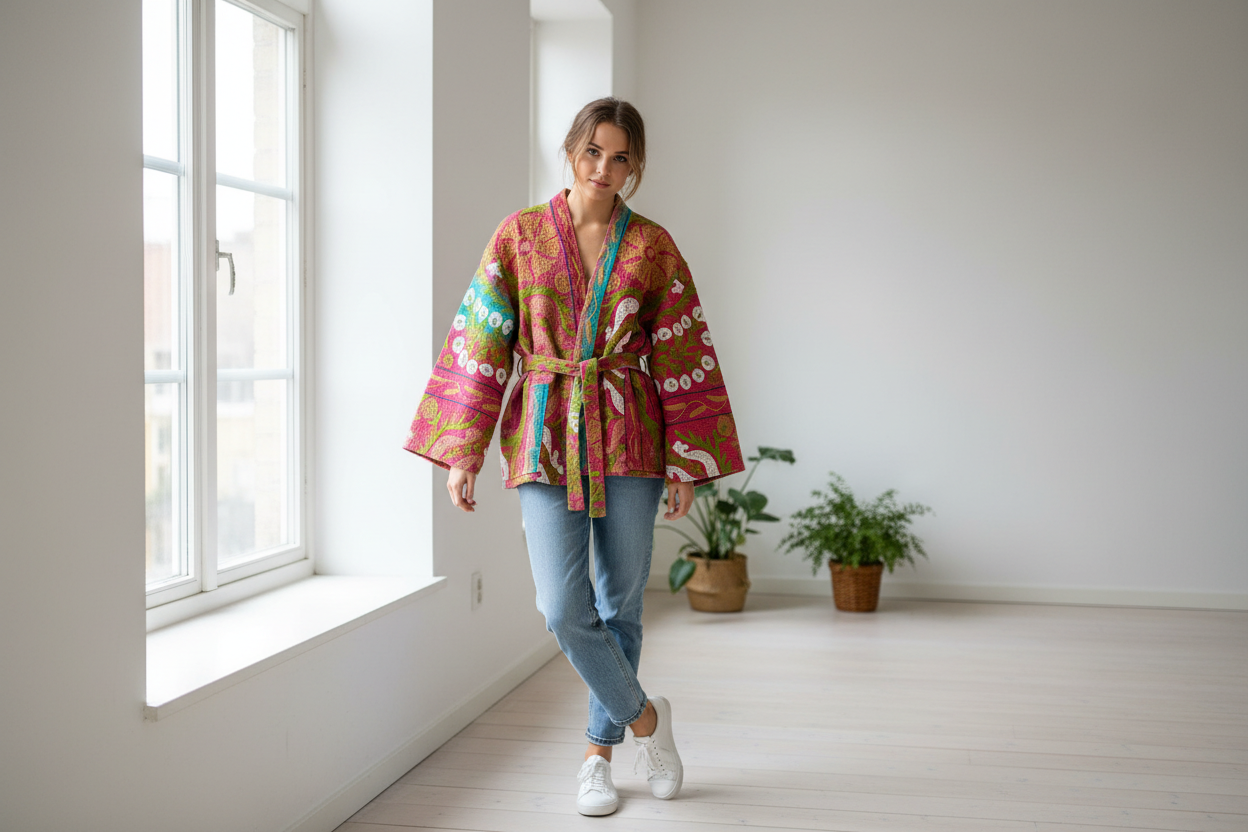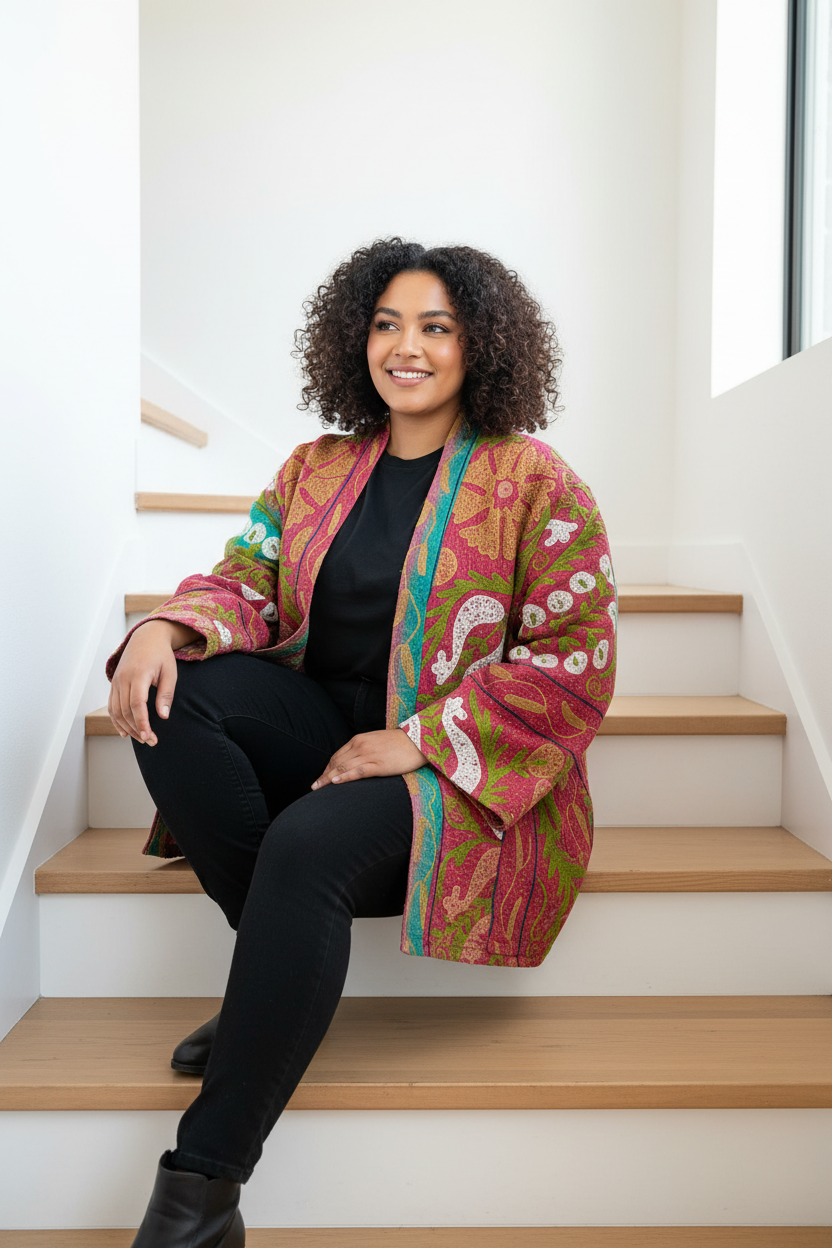 With its vintage-inspired Suzani embroidery on one side and traditional Kantha hand-stitching on the other, this piece effortlessly blends bold design with cozy comfort. A vivid blend of deep magenta, golden mustard, emerald green, and aqua blue, accented with intricate white hand-embroidered animal . Other side sage green, lavender, soft peach, and creamy beige, delicate multicolored threadwork in floral and paisley-inspired patterns. +Comes with a matching fabric belt–wear it open or tied for a more structured fit.