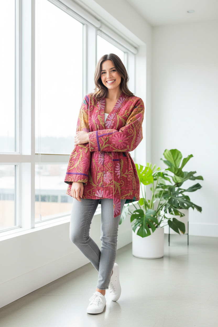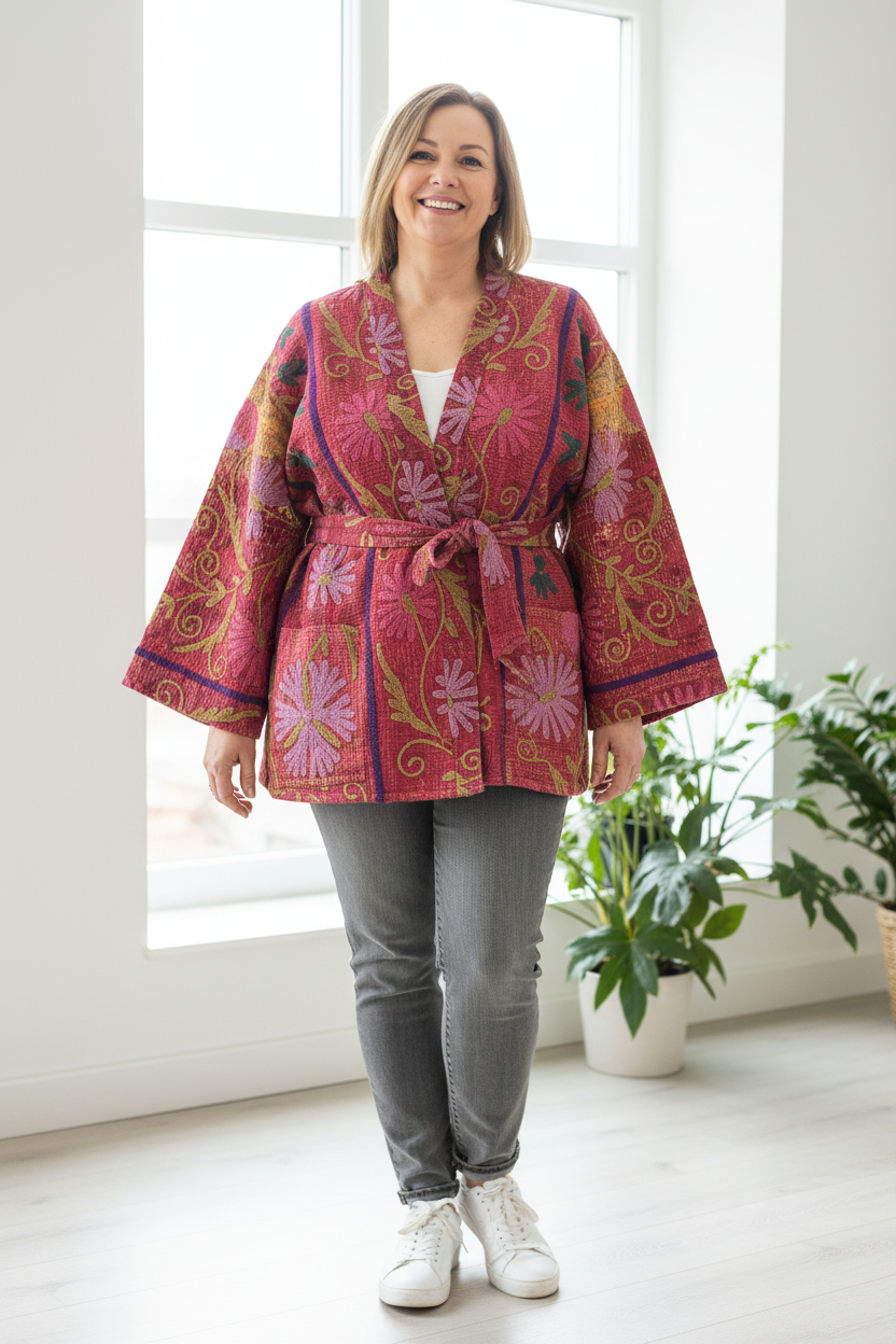 With its vintage-inspired Suzani embroidery on one side and traditional Kantha hand-stitching on the other, this piece effortlessly blends bold design with cozy comfort. Made from 100% repurposed cotton textiles, this jacket is reversible, making it like two jackets in one!