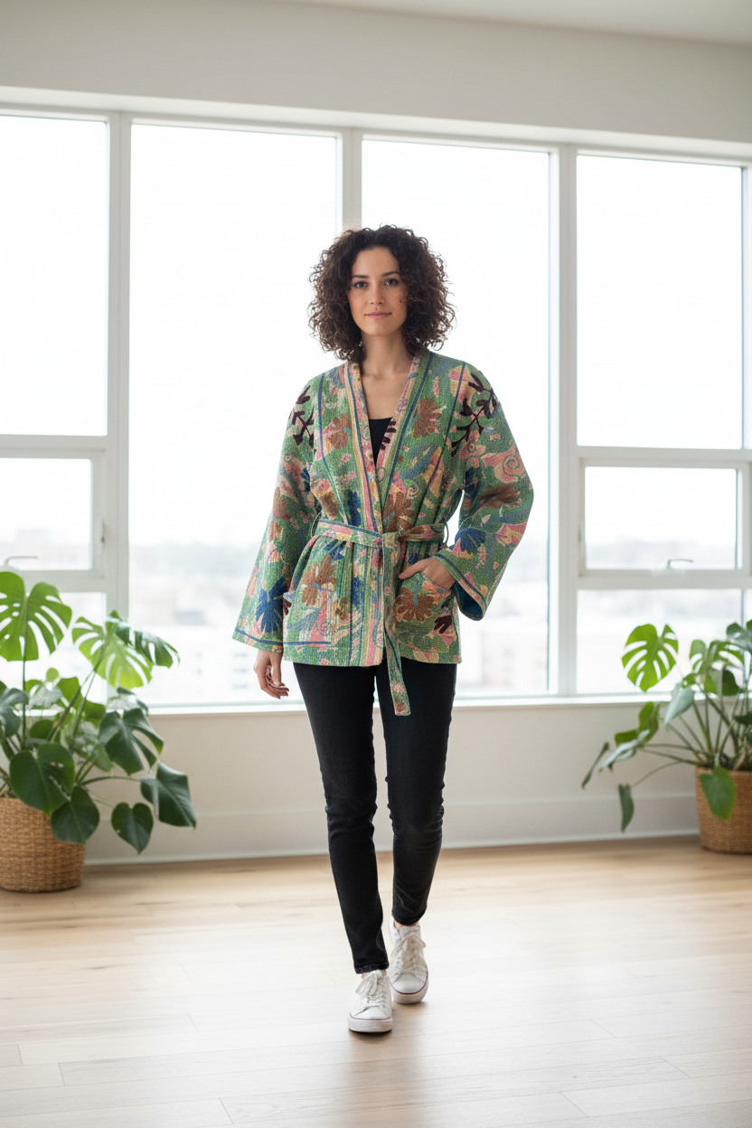 With its vintage-inspired Suzani embroidery on one side and traditional Kantha hand-stitching on the other, this piece effortlessly blends bold design with cozy comfort. Made from 100% repurposed cotton textiles, this jacket is reversible, making it like two jackets in one! a Side One features a lush green base adorned with multicolored floral and leafy motifs in earthy browns, deep blues, rosy pinks, and sunny yellows. Accents of peach, coral, and sky blue add a whimsical charm, with intricate kantha stitching throughout for texture and depth. Side Two offers a more serene palette with a cool blue base, embellished with muted brown and dark plum floral embroidery. Hints of the vibrant green and multicolor patterns from the reverse peek through the neckline and interior, creating a harmonious blend.
