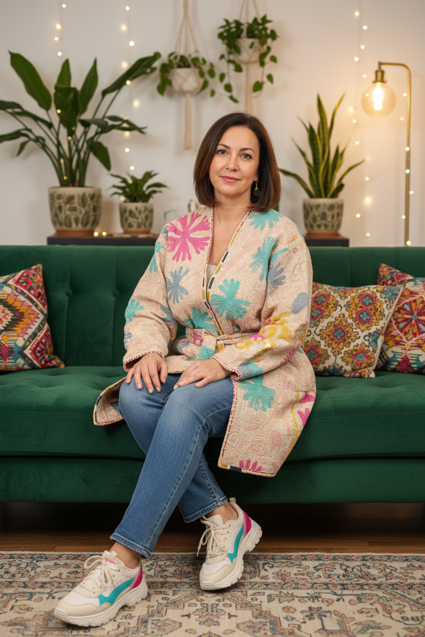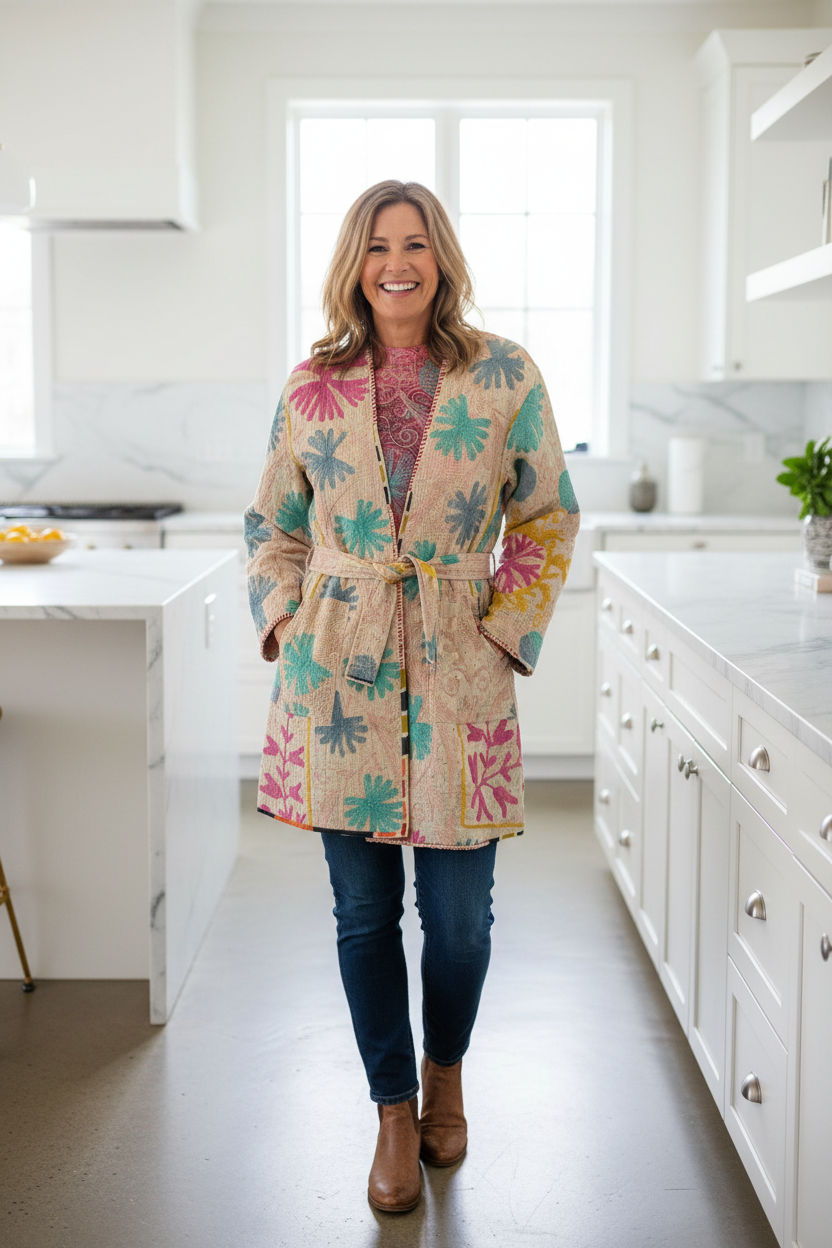 Elevate your style with this exquisite handcrafted Kantha Suzani jacket, a wearable work of art blending traditional craftsmanship with modern boho flair. This reversible piece features vibrant hand-embroidered wool Suzani motifs layered over soft, repurposed cotton with intricate kantha stitchwork throughout.