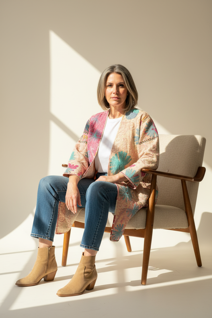 Perfect for layering year-round, this open-front kimono-style jacket is relaxed, elegant, and sustainably made. Whether paired with jeans or dressed up for a special occasion, this piece adds texture, color, and story to your wardrobe.
