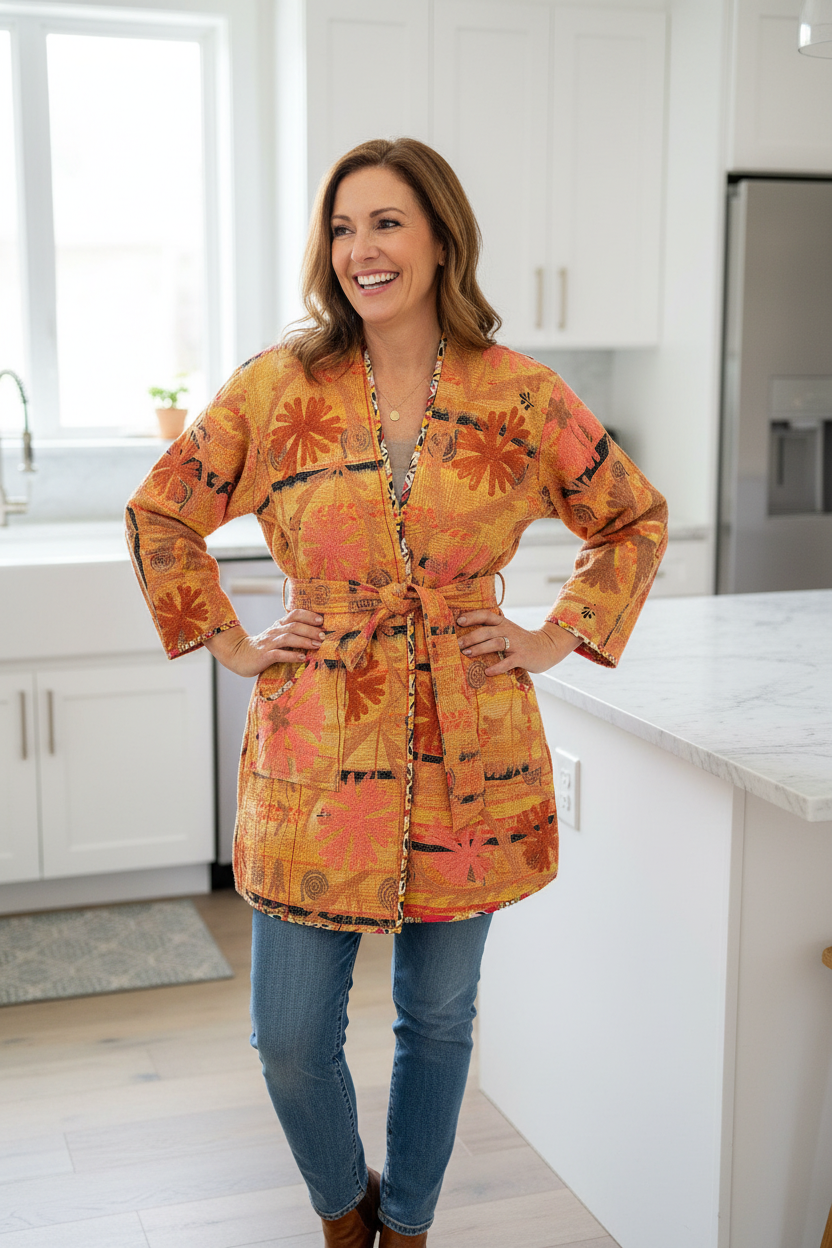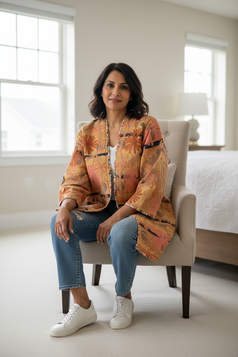 Add a touch of artisan magic to your wardrobe with this handmade Reversible Kantha Suzani Jacket, featuring vibrant floral embroidery, earthy tones, and timeless craftsmanship. This jacket is not just clothing—it’s wearable art!