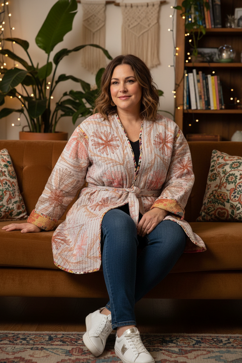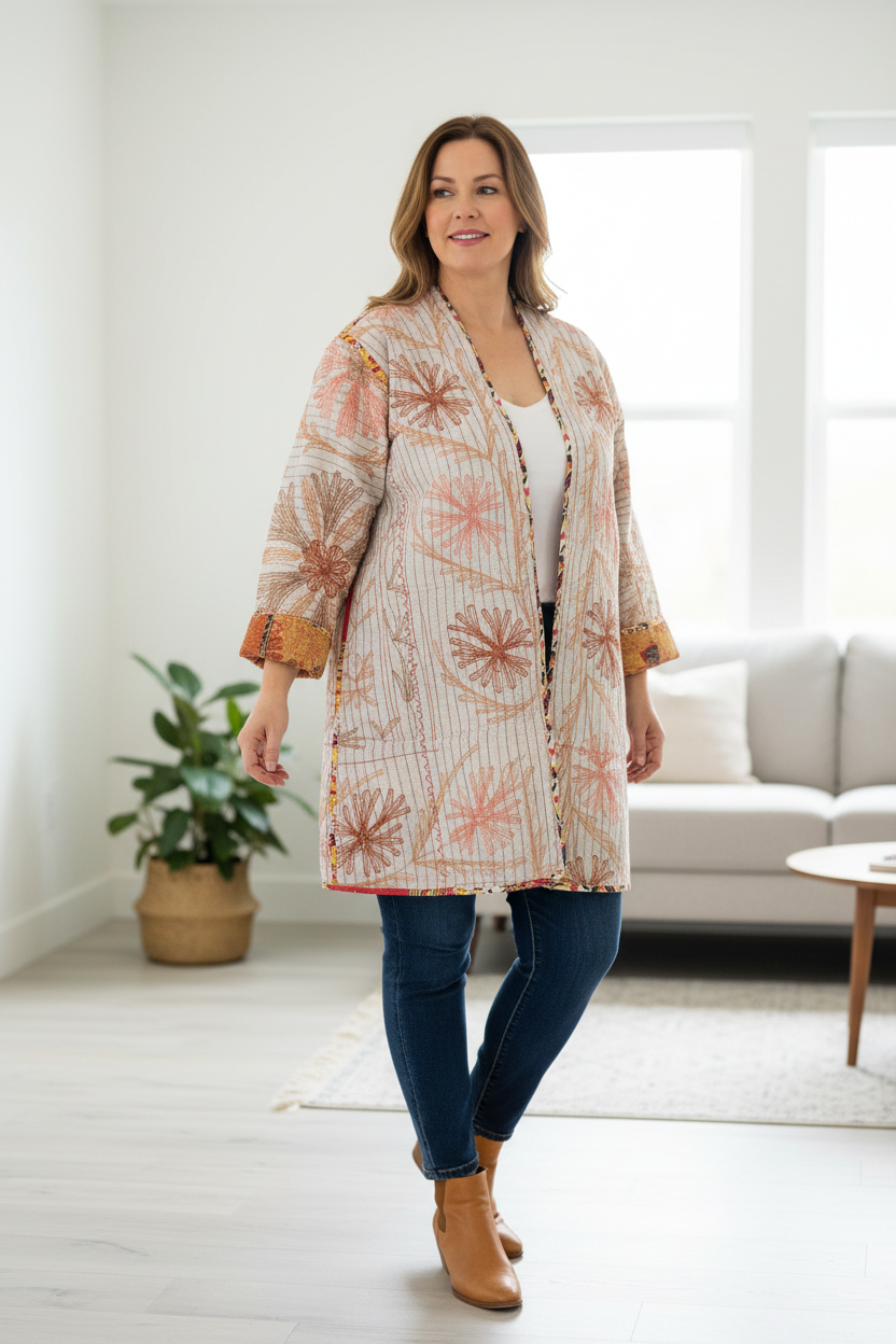 With its vintage-inspired Suzani embroidery on one side and traditional Kantha hand-stitching on the other, this piece effortlessly blends bold design with cozy comfort. Made from 100% repurposed cotton textiles, this jacket is reversible, making it like two jackets in one!