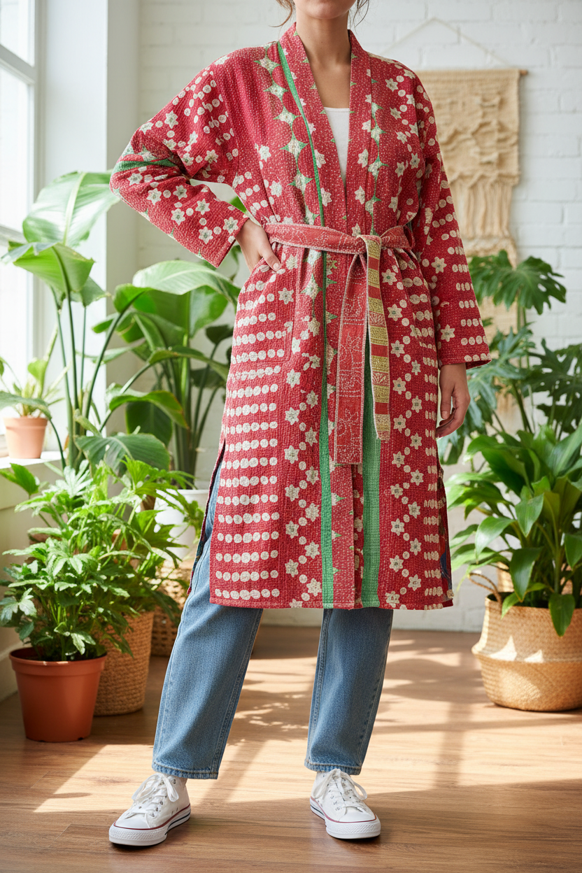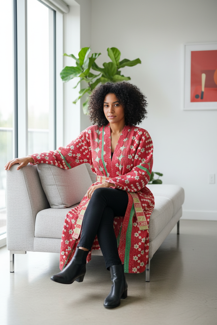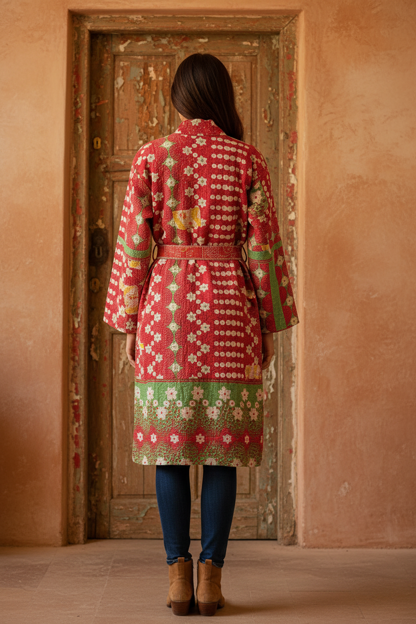 Our stunning handcrafted reversible kantha kimono robes are made from 4-5 layers of fine vintage cotton saris.