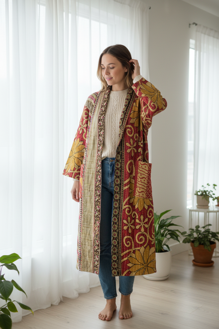 This light weight multicolored beautifully handcrafted long jacket with dropped shoulder, easy, long sleeves. Belt to tie or style. Being handmade from recycled saris, no two are the same. Each robe/jacket is unique in pattern with colors contrast that compliments the design.