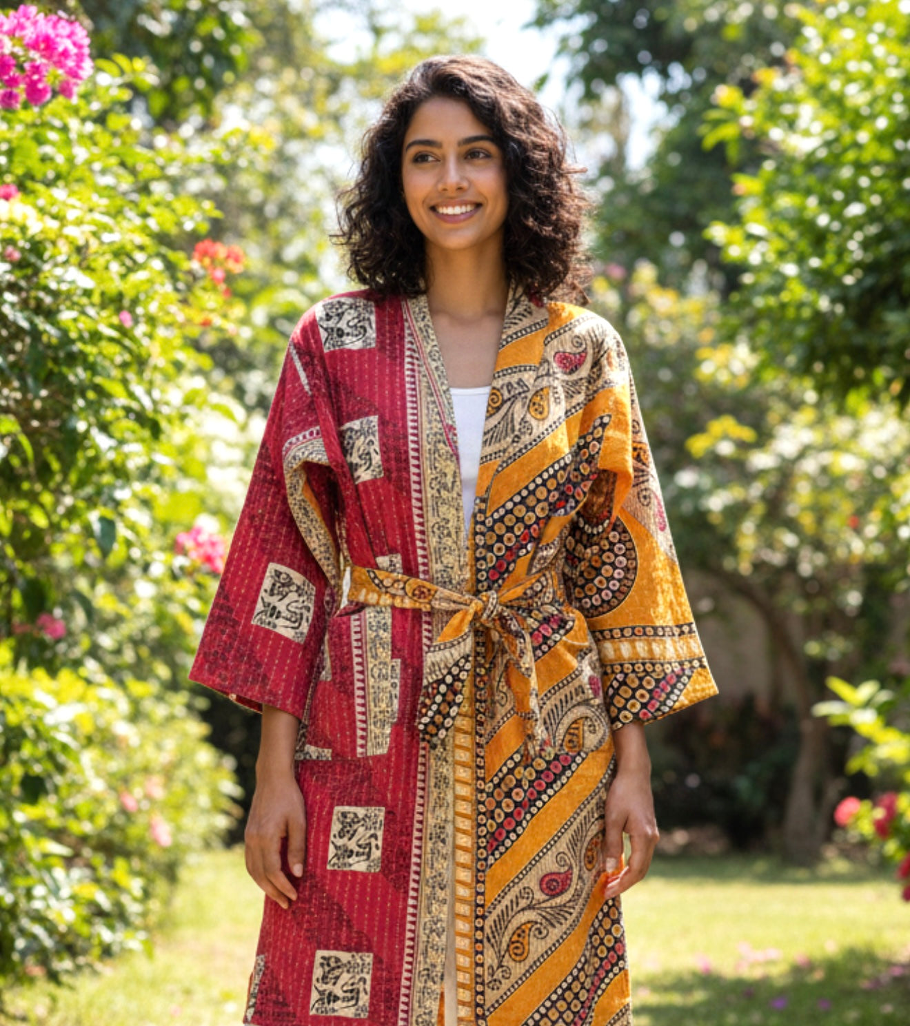 This light weigh colorful, beautifully handcrafted long Kantha jacket/robe with dropped shoulder, easy, long sleeves. Belt to tie or style. Being handmade from recycled saris, no two are the same. Each robe/jacket is unique in pattern with colors contrast that compliments the design.