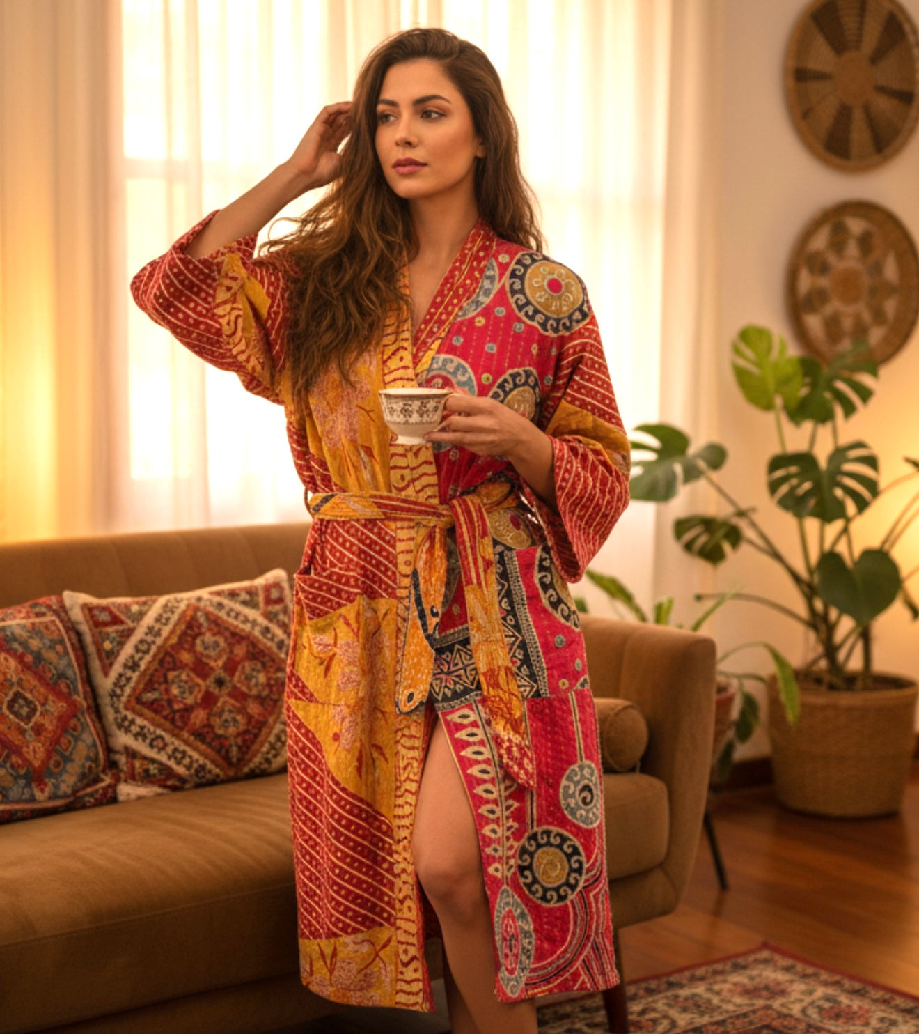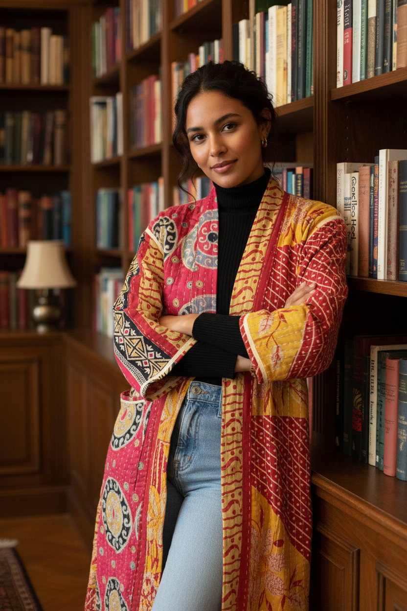 This light weight colorful, beautifully handcrafted long Kantha jacket/robe with dropped shoulder, easy, long sleeves. Belt to tie or style. Being handmade from recycled saris, no two are the same. Each robe/jacket is unique in pattern with colors contrast that compliments the design.