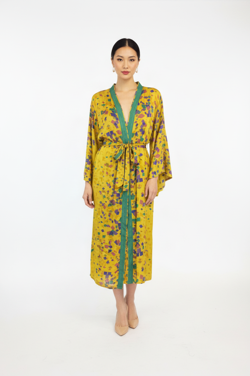 Vintage silk mix sari kimono in beautiful color with abstract prints. Its 130cm long and gives beautiful fall. Its made of recycled Indian saris. It surely feels like feather on your skin.
