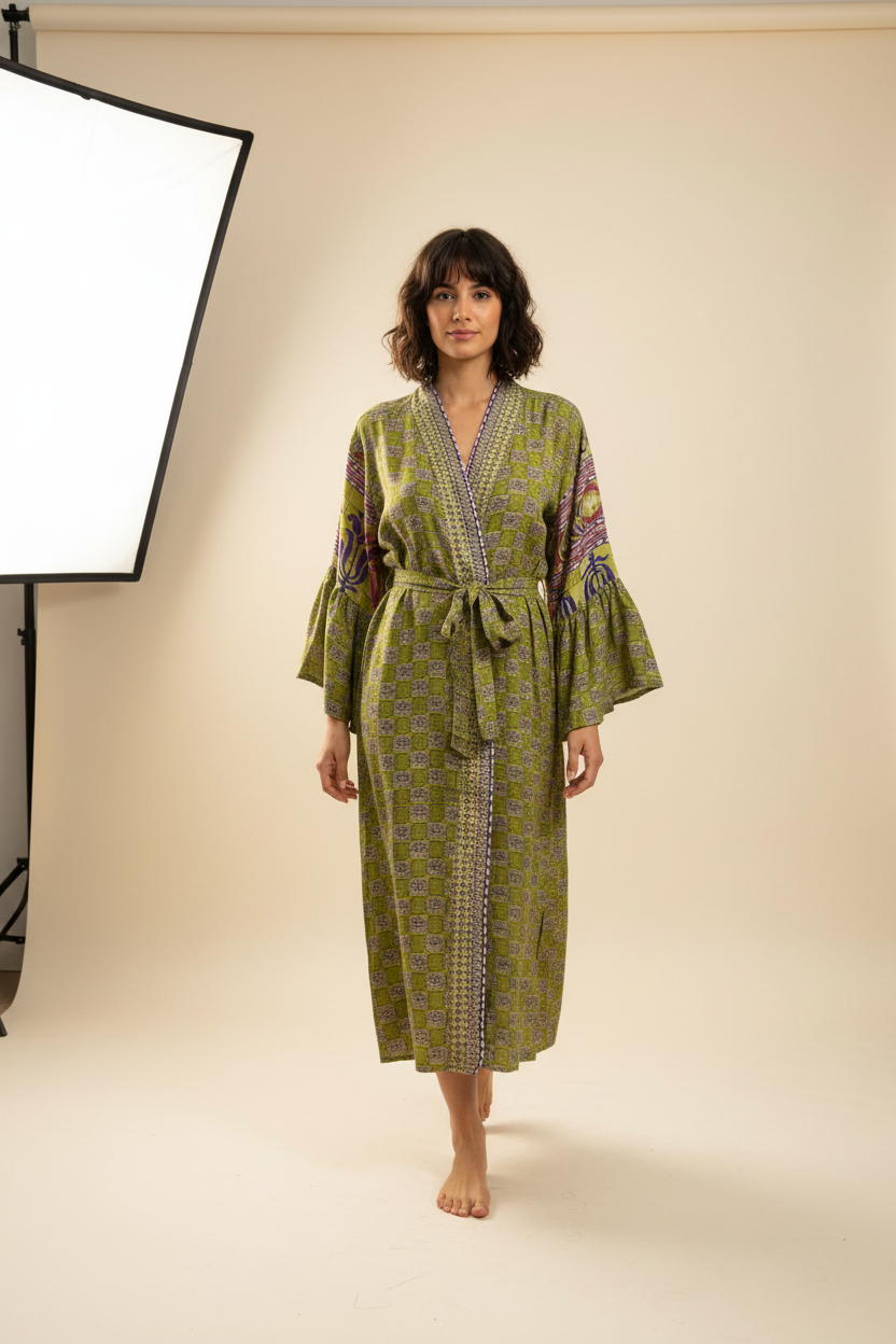 Vintage sari Luxurious kimono in beautiful color with small floral prints. Its 130cm long and gives beautiful fall. Its made of recycled Indian saris. It surely feels like feather on your skin.