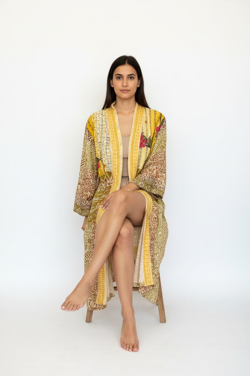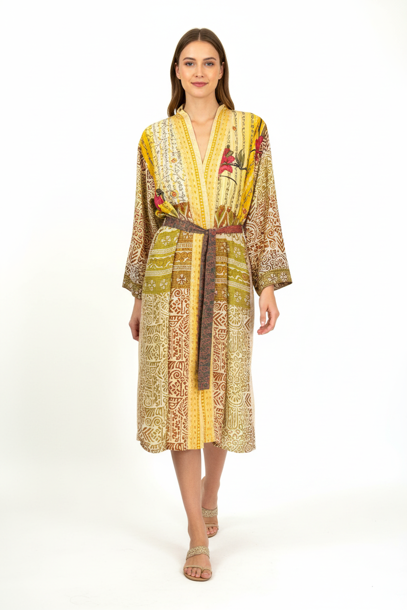 Vintage sari Luxurious kimono in beautiful color combo. Its 130cm long and gives beautiful fall. Its made of recycled Indian saris. It surely feels like feather on your skin.