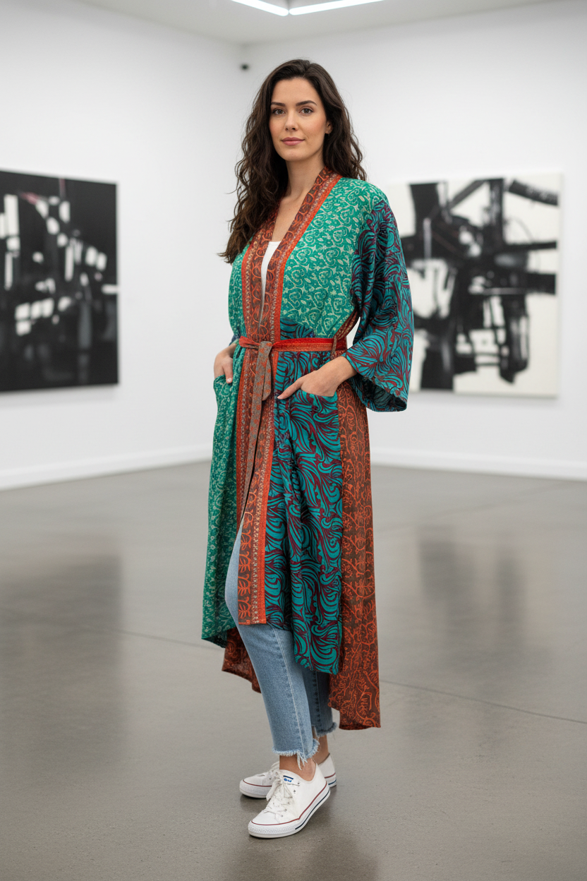 Vintage sari kimono in beautiful color with patchwork. Its 110cm long and gives beautiful fall. Its made of recycled Indian saris. It surely feels like feather on your skin.