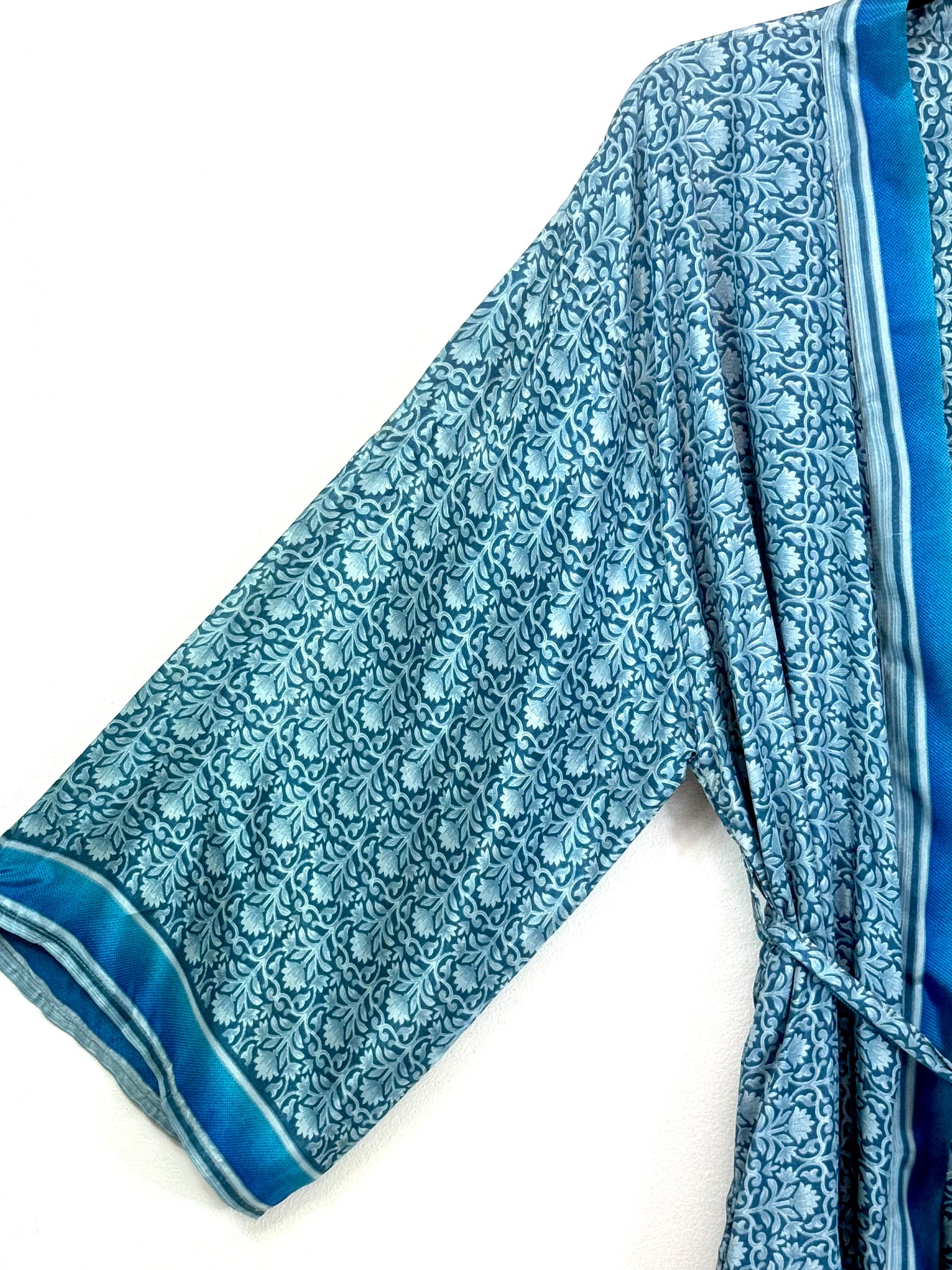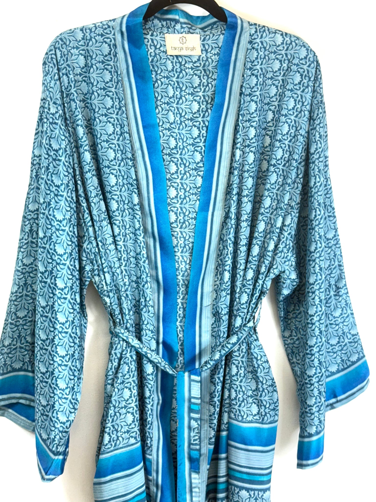 Vintage sari Luxurious kimono in beautiful blue/grey color. Its 120cm long and gives beautiful fall. Its made of recycled Indian saris. It surely feels like feather on your skin.