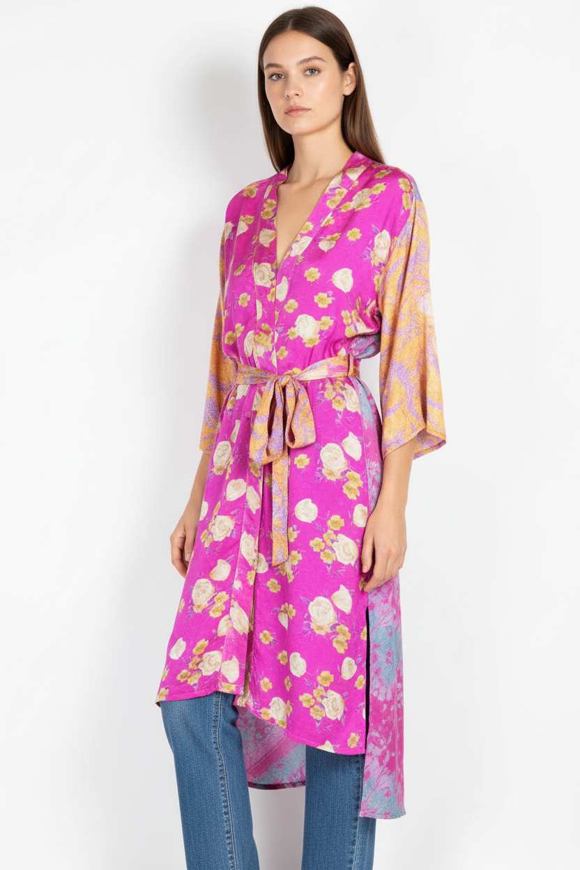 Vintage sari Luxurious kimono in beautiful pink patchwork. Its 120cm long and gives beautiful fall. Its made of recycled Indian saris. It surely feels like feather on your skin.