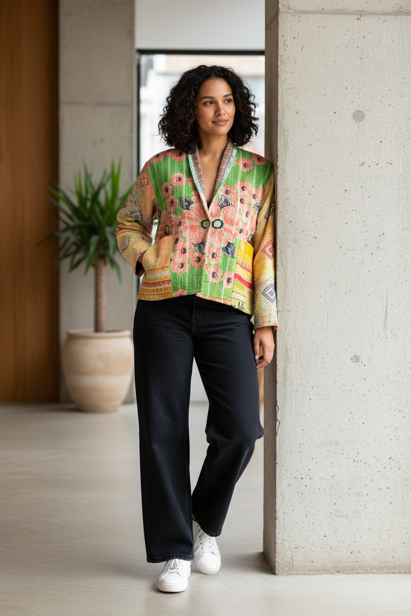 These vintage kantha materials are upcycled and turned into beautiful jackets. Each piece is a one of piece and also reversible meaning 2 Jackets for the price of 1! They are incredibly comfy and cozy and perfect to give your everyday outfit a bit pf character and color! These kanthas jackets never can never outdated and could be worn all year!