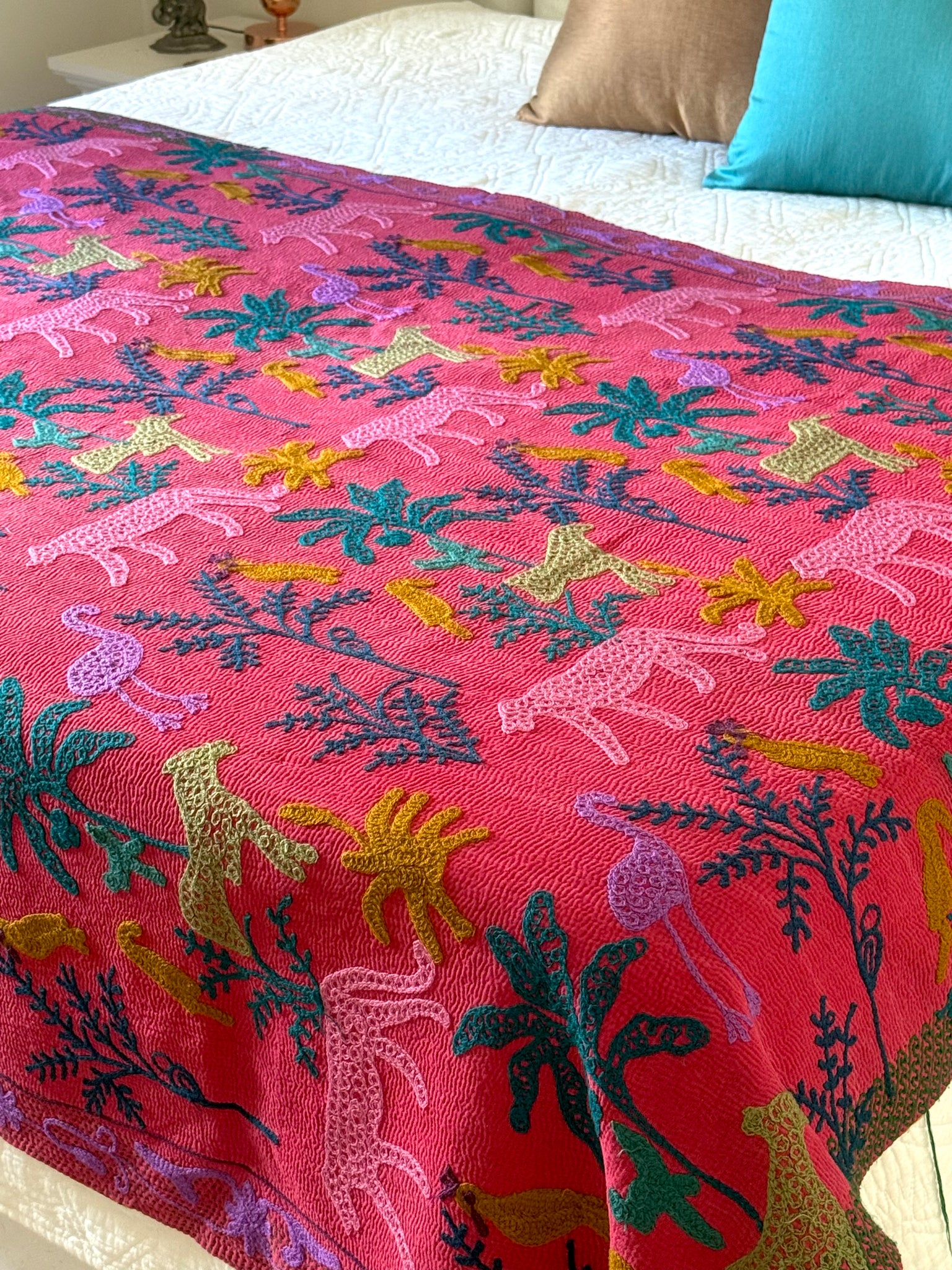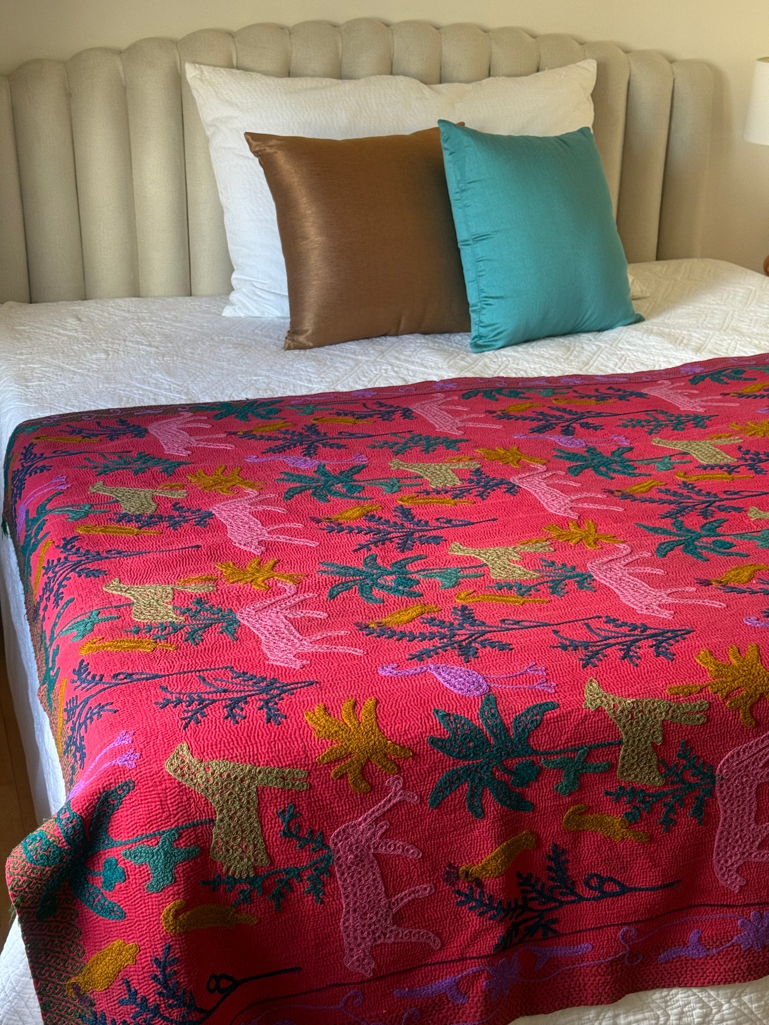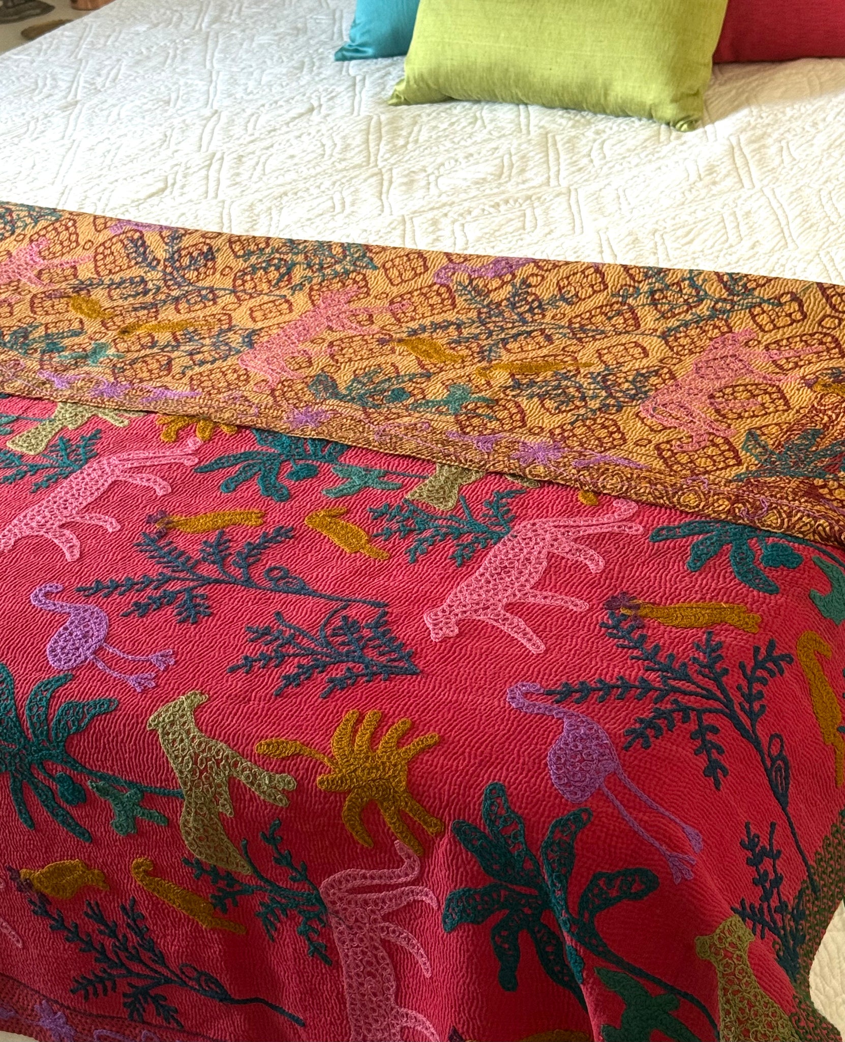 Perfect for bohemian, charming embroidery features a lively, dark fuchsia pink/red base with playful animal and tropical plant motifs in mustard yellow, pink, lavender, teal, and green. The reverse side is a rich patchwork of saffron yellow, rust red, teal blue, and maroon, with intricate Suzani floral and animal embroidery. A bold, colorful statement piece perfect for boho or eclectic interiors.