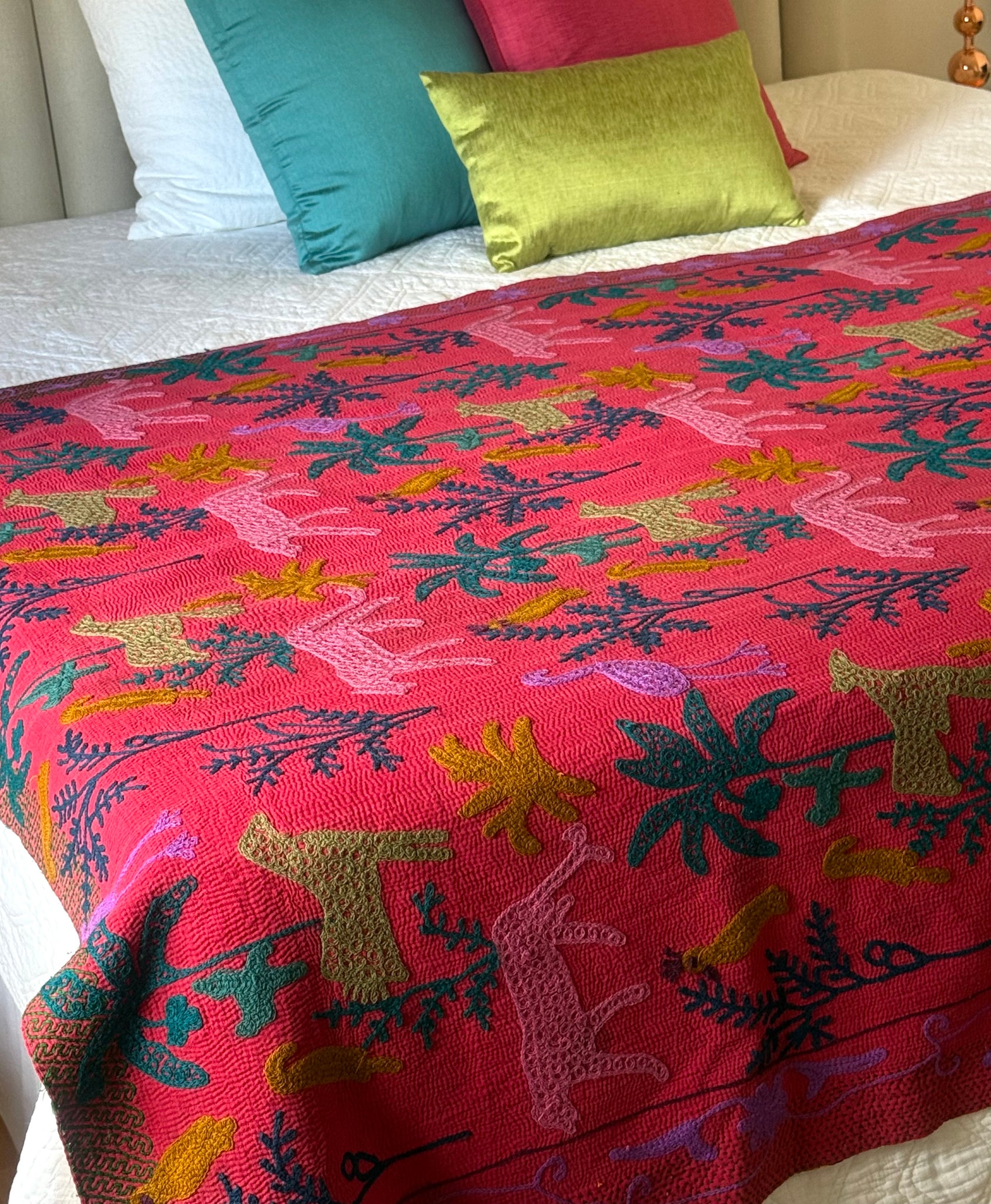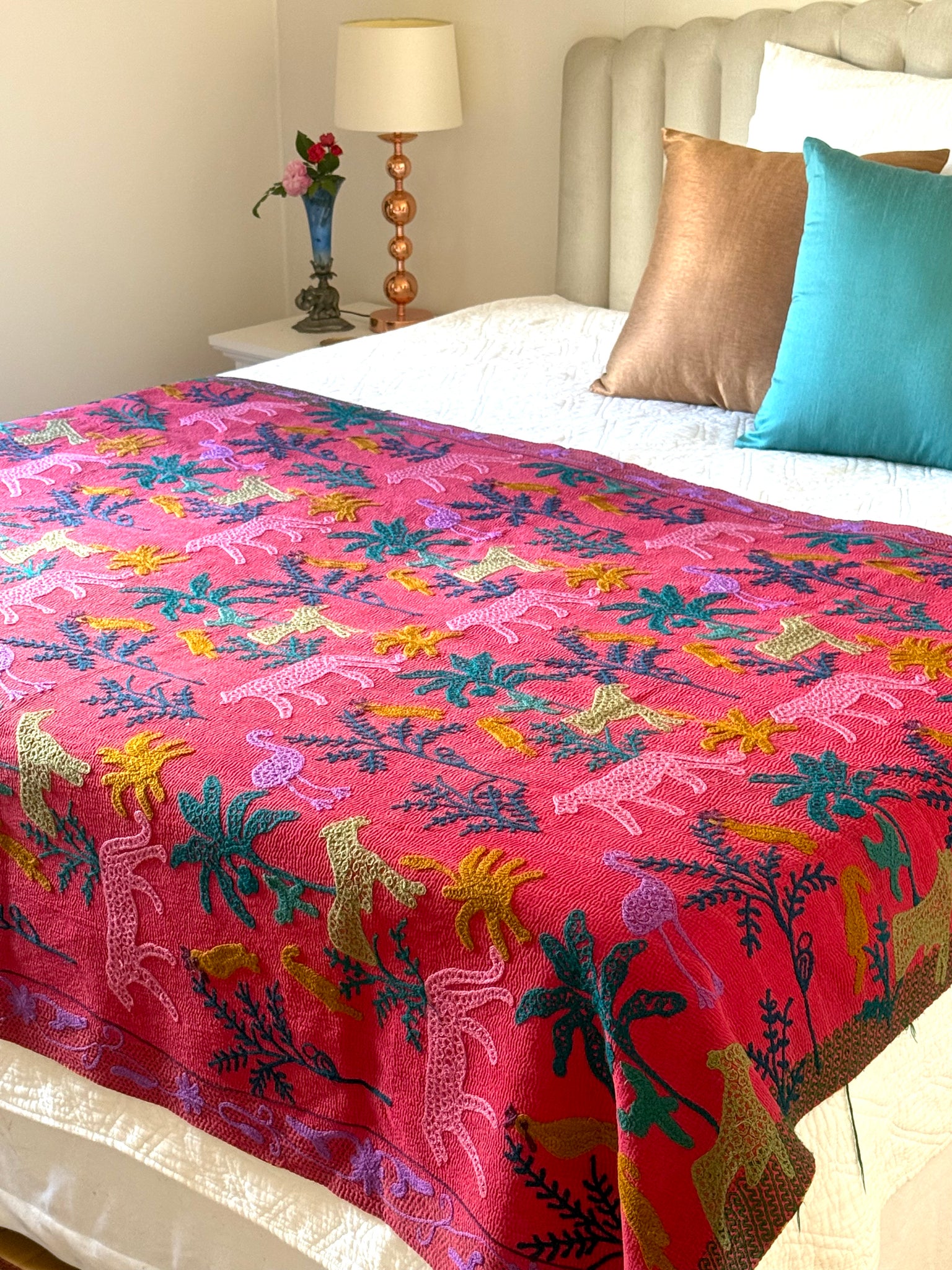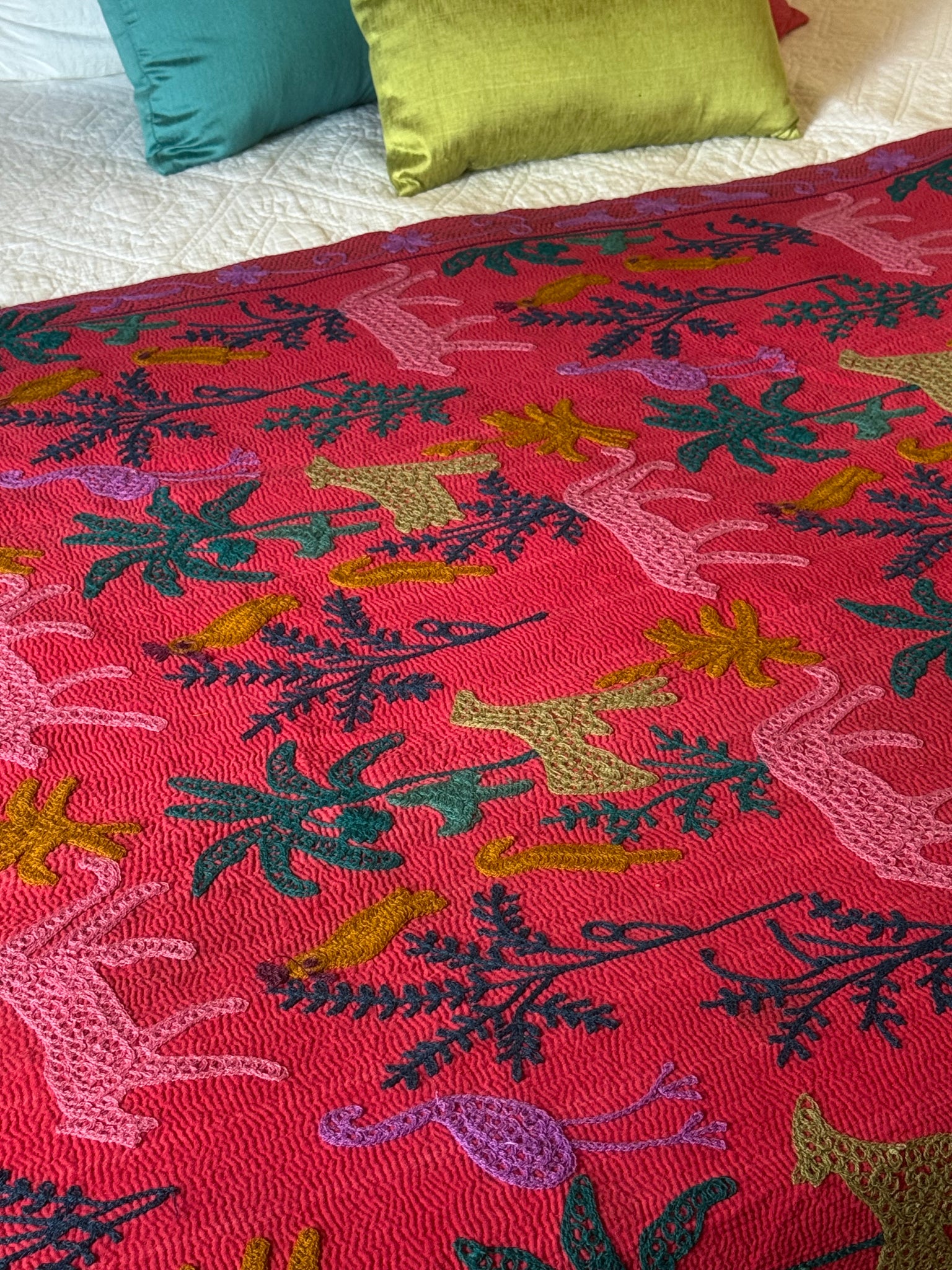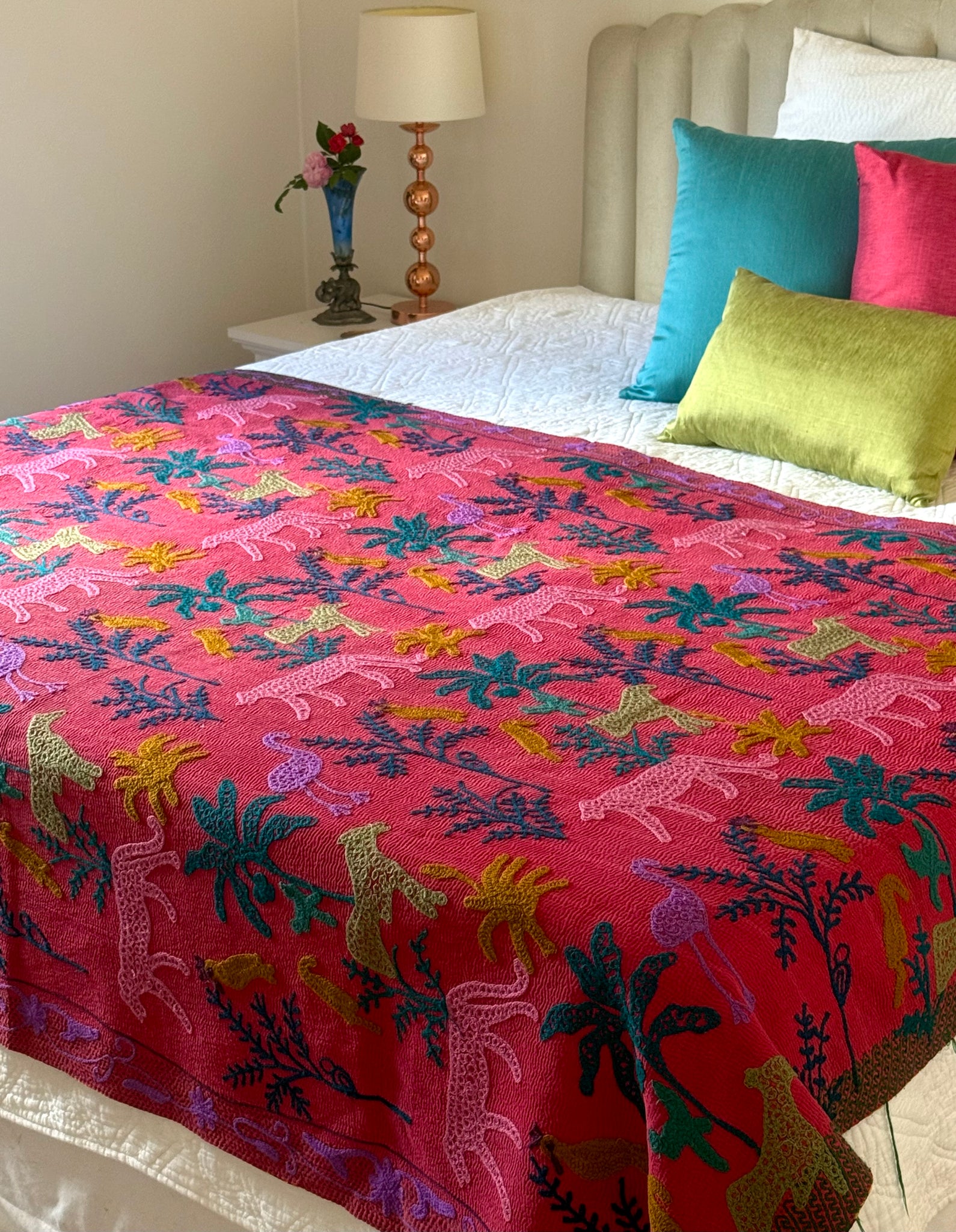 Perfect for bohemian, charming embroidery features a lively, dark fuchsia pink/red base with playful animal and tropical plant motifs in mustard yellow, pink, lavender, teal, and green. The reverse side is a rich patchwork of saffron yellow, rust red, teal blue, and maroon, with intricate Suzani floral and animal embroidery. A bold, colorful statement piece perfect for boho or eclectic interiors.