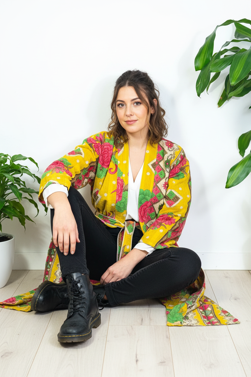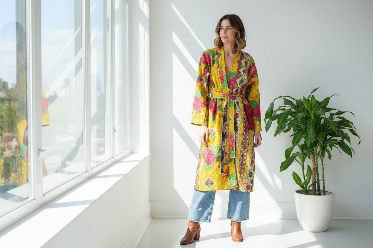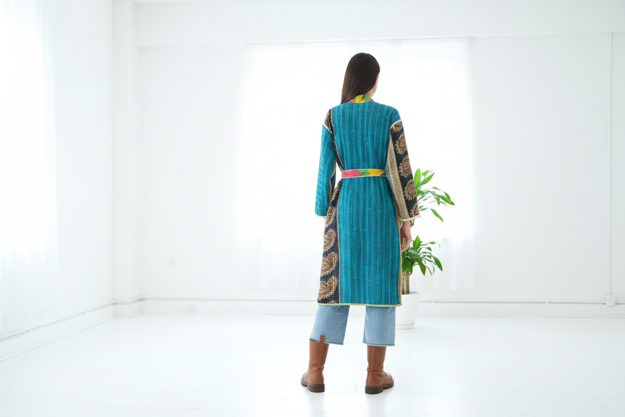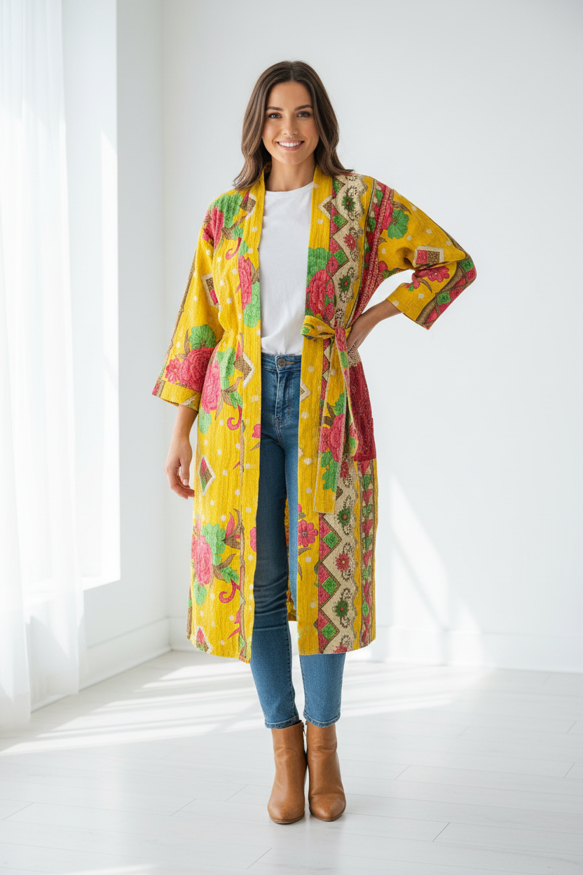 Our stunning handcrafted reversible kantha kimono robes are made from 4-5 layers of fine vintage cotton saris.