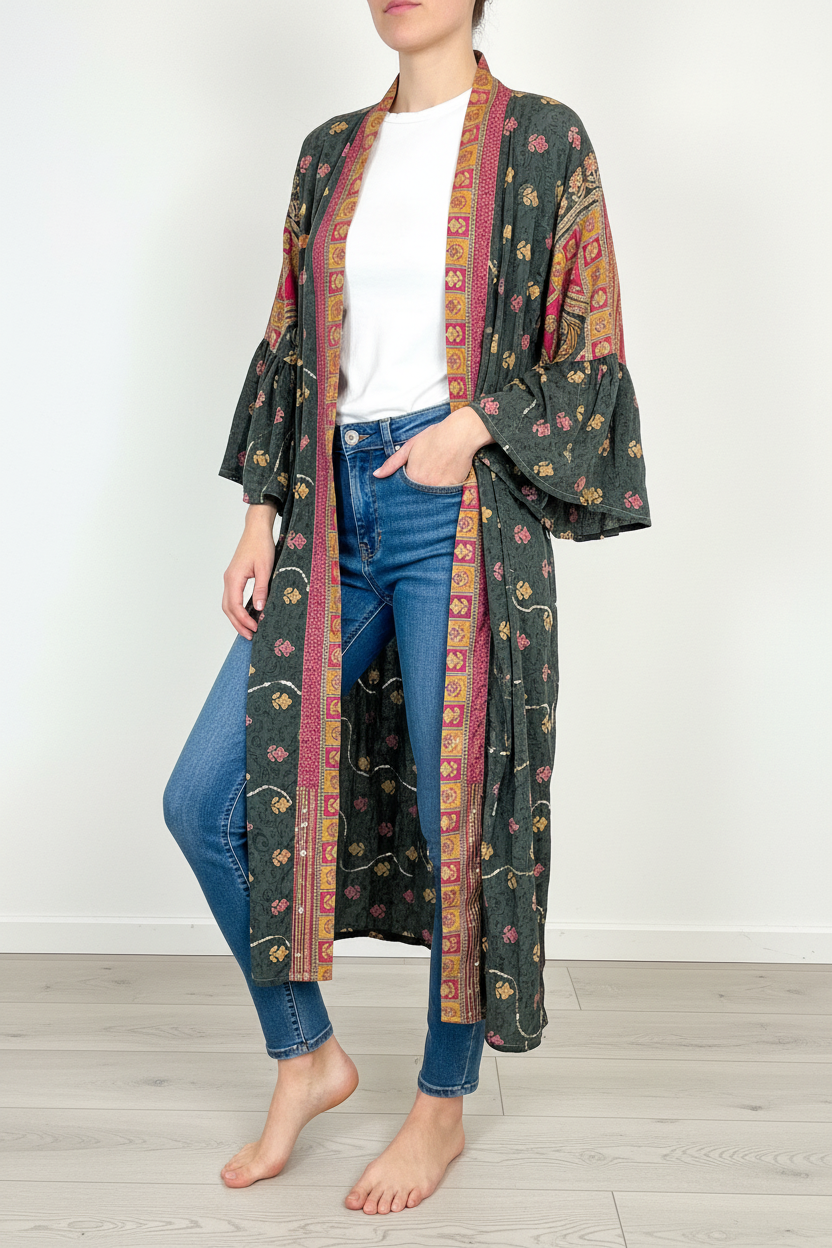 Vintage silk sari Luxurious kimono in beautiful color combo. Its 130cm long and gives beautiful fall. Its made of recycled Indian saris. It surely feels like feather on your skin. It has sequinces which gives might fall after some time.