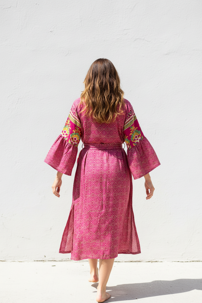 Vintage silk mix Luxurious kimono in beautiful color with small prints. It is 130cm and gives beautiful fall. Its made of recycled Indian saris. It surely feels like feather on your skin.